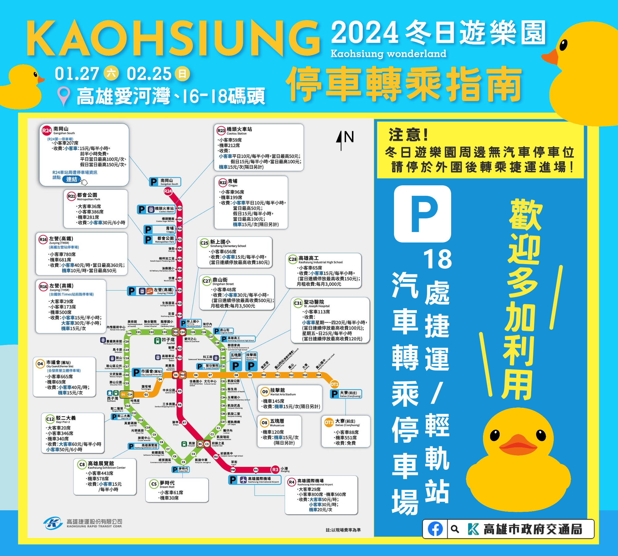 高雄輕軌也特別設計了限定版的小鴨輕軌列車,車廂外以黃色小鴨為主角,一路穿越高雄流行音樂中心、85大樓、大港橋等高雄著名地標,還能在高雄市區各處尋找小鴨身影,並有14個黃色角落可以去探尋,來到愛河灣也別忘了乘坐愛之船,沿著愛河體會一番高雄燈會的熱鬧吧!